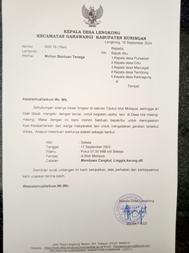 Sesuai dengan surat Edaran dari Kepala Desa Lengkong terkait longsor tebing yang menutup saluran irigasi yang terjadi di Desa Purwasari, terpatnya di saluran irigasi Cipikul blok. Molopos. Surat bantuan gerakan gotong royong tersebut di tujukan ke beberapa Desa yaitu: DesaPurwasari, Desa Citiusari, Desa Mancagar, Desa Tembong, Desa Kaduagung.
