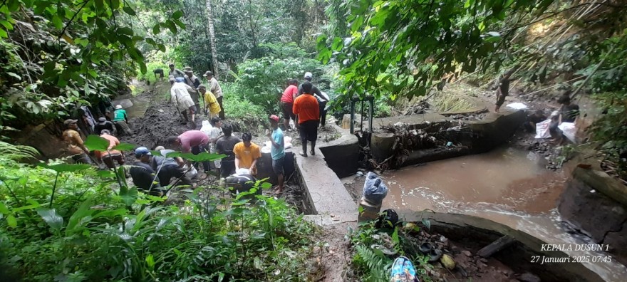 Karangtawang, Senin 27 Januari 2025. Air merupakan sumber kehidupan, tidak terlepas bagi petani untuk mengairi lahan sawah guna kepentingan mengolah tanah dan penyiraman tanaman. Dalam hal ini penting adanya pemeliharaan saluran irigasi yang mengalir dari hulu ke hilir. Pada hari ini Petani Desa Mancagar berangkat menuju ke hulu (Cipikul - Desa Karangtawang) untuk membersihkan saluran irigasi dari longsoran tanah akibat dari turunya hujan yang mengguyur wilayah Kuningan, sehingga di area tebing tekstur tanah menjadi labil dan menyebabkan longsor.